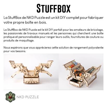 Vous recherchez une boîte de rangement qui vous permettra de ranger facilement votre matériel de bricolage, de couture ou de dessin ? La StuffBox de NKD Puzzle est la solution idéale pour vous ! Ce kit de bricolage complet vous permet de construire votre propre boîte en bois, éthique selon vos goûts et adaptée à vos besoins.